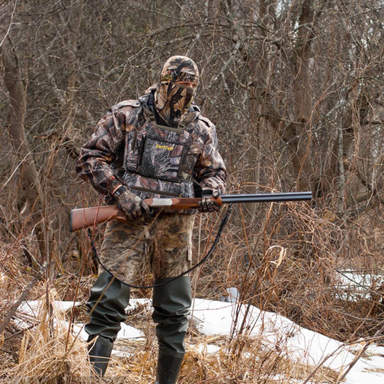 Stay warm, comfortable, and hands-free during your next hunting expedition with the CarriTurf Binocular Harness Chest Bag.